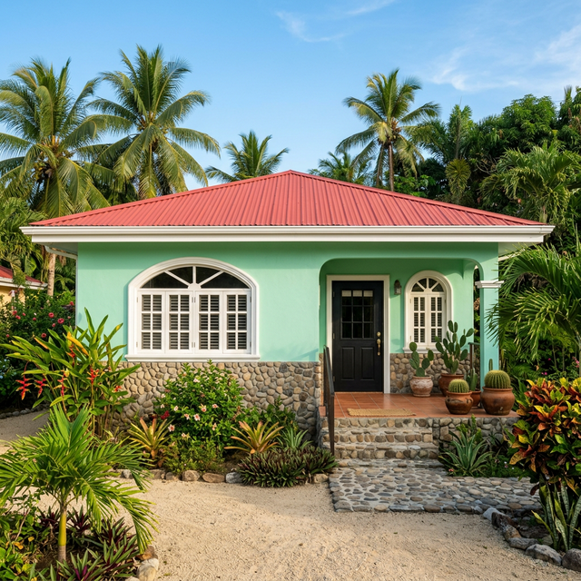 Arquitectura adaptada al clima de la costa de Honduras. Colores vivos y diseño acogedor de 1 nivel.